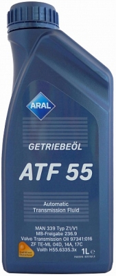 Aral Getriebeöl ATF 55 рекомендуется для использования в современных автоматических трансмиссиях автомобилей производства концерна GM (до 2005 года - Dexron II или III). Одобрен к применению в тяжелонагруженных трансмиссиях Allison в соответствии с требованиями класса качества TES 389. Благодаря большому количеству допусков, может использоваться в автоматических трансмиссиях коммерческого транспорта. Может применяться в некоторых гидравлических системах рулевого управления. Не использовать в агрегатах, где требуется применение жидкостей класса качества MERCON V, MERCON SP или DEXRON VI.